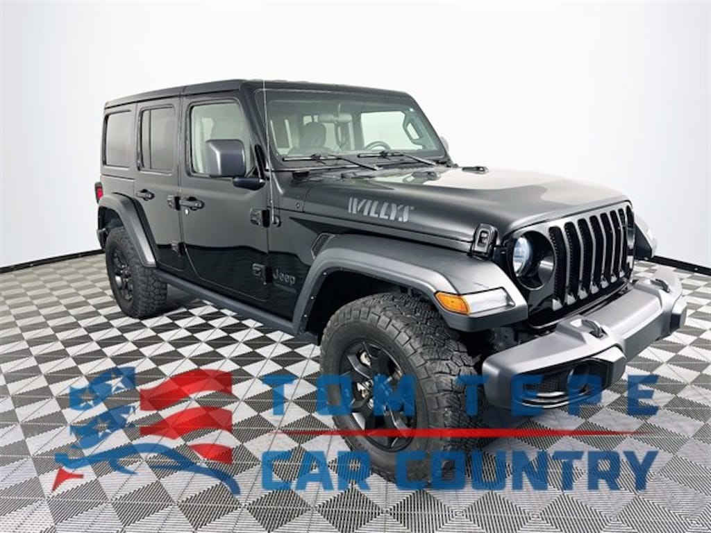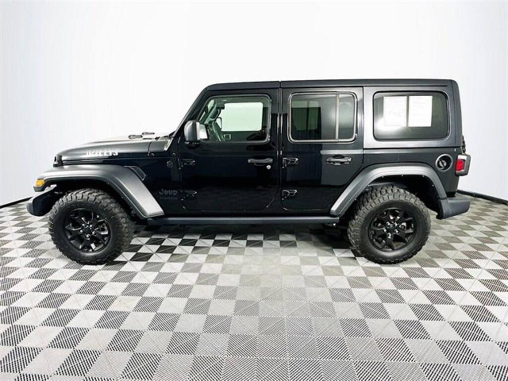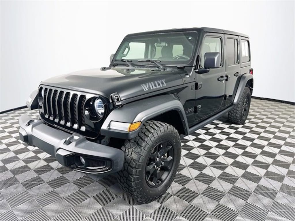 2021 Jeep Wrangler Unlimited Willys 8-Speed Automatic 2.0L I4 DOHC Black Clearcoat Odometer is 20164 miles below market average! Carfax One-Owner, 4-Wheel Disc Brakes, 4-Wheel Drive Swing Gate Decal, 8 Speakers, ABS brakes, Air Conditioning, Anti-Spin Differential Rear Axle, Aux Battery, Black 3-Piece Hard Top, Brake assist, Deep Tint Sunscreen Windows, Delay-off headlights, Dual front impact airbags, Dual front side impact airbags, Electronic Stability Control, Freedom Panel Storage Bag, Front Bucket Seats, Front Center Armrest w/Storage, Front fog lights, Integrated roll-over protection, Low tire pressure warning, Occupant sensing airbag, Outside temperature display, ParkView Rear Back-Up Camera, Power steering, Radio: Uconnect 3 w/5 Display, Rear Window Defroster, Rear Window Wiper/Washer, Speed control, Steering wheel mounted audio controls, Stop-Start Dual Battery System, Telescoping steering wheel, Tilt steering wheel, Traction control, Trip computer, Variably intermittent wipers, Wheels: 17 x 7.5 Moab Black Aluminum.