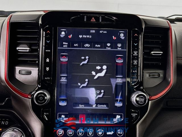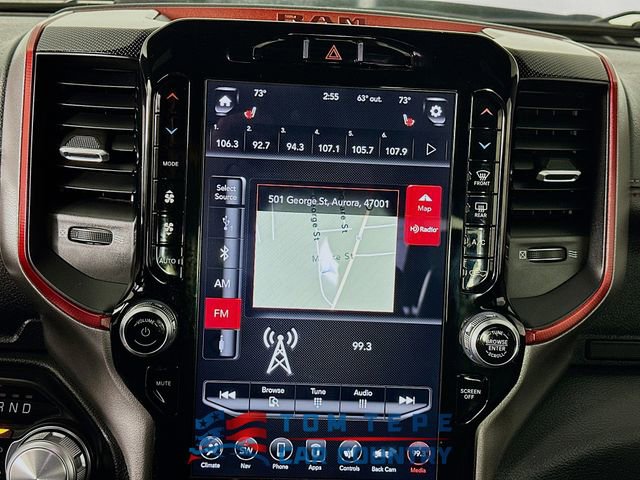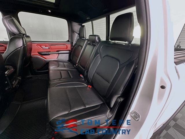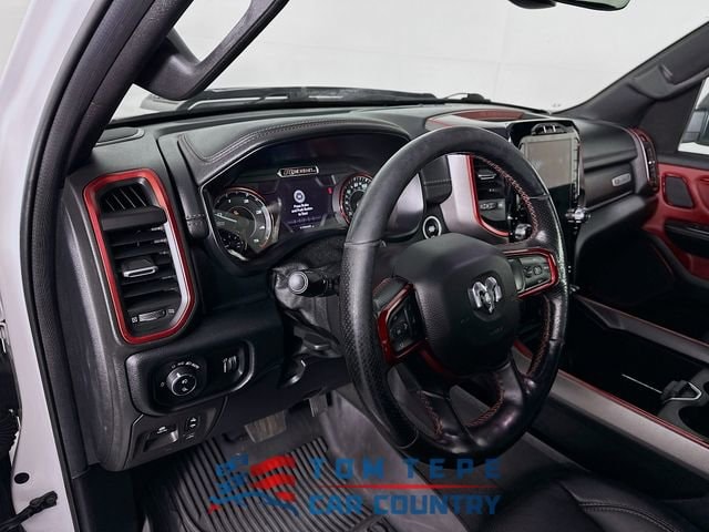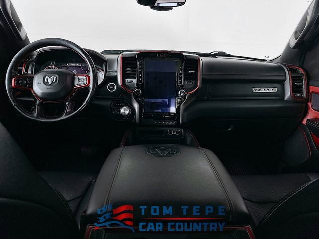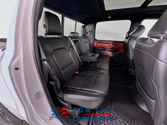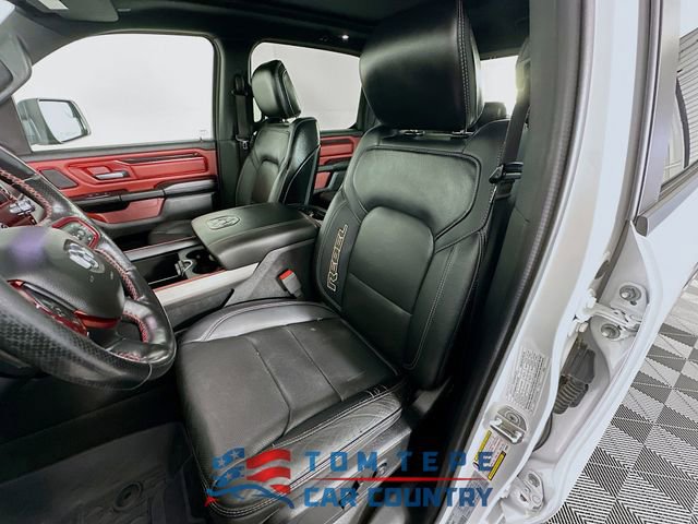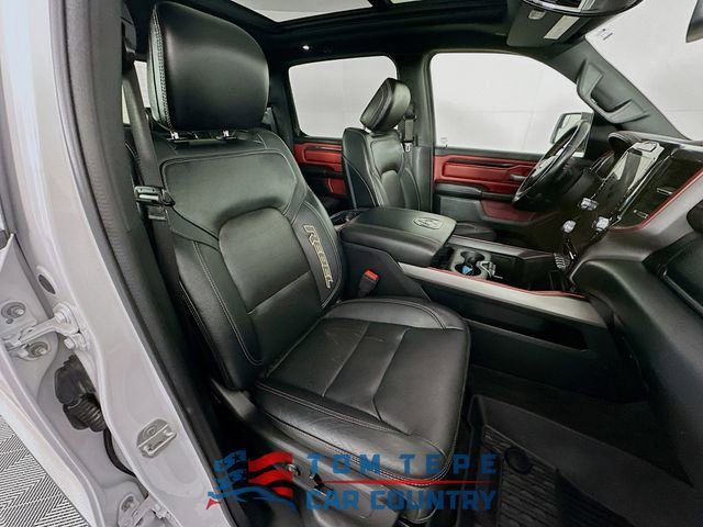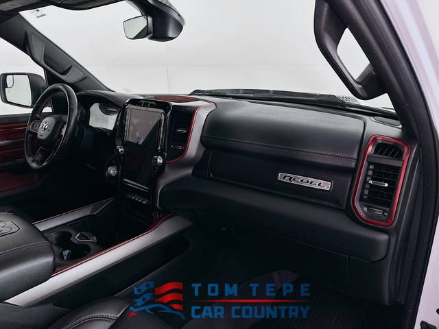 Step inside, and you'll quickly realize this Rebel isn't just about toughness; it's about comfort, too. The cabin features luxury leather-trimmed bucket seats, heated front and second-row seats, and a heated steering wheel that Midwest drivers will appreciate every winter. Power-adjustable seats with memory, adjustable pedals, and a full-length upgraded floor console make long drives feel effortless.